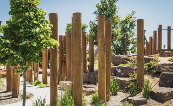 Loads of visually interesting elements provide this park with a sense of style hard to find in new urban communities these days. Bespoke designed materials, playground with fun and different play elements including boulders, bespoke swings, climbing mounds, and hard carved sculptures are all part of the fun here.